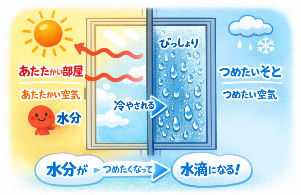 温かい空気中の水分 が 外の冷たい空気で冷やされること。(イメージ)